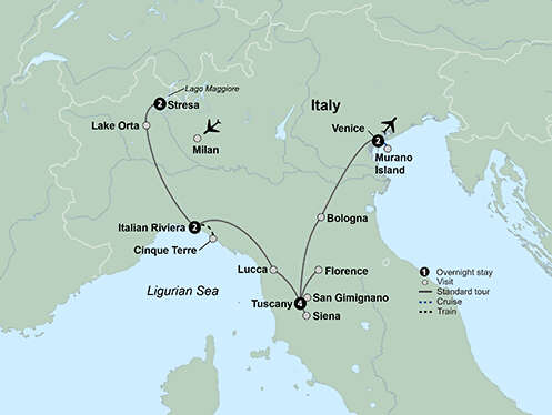 Vineyards, olive groves, and cities that float. Incredible history, indelible culture, and unforgettable cuisine. This is l’Italia at its most iconic. Enjoy the natural beauty and calm of the Alpine Lakes region. Snake along the edge of the sea to the medieval villages of Cinque Terre. Relax during a leisurely 4-night stay at a Tuscan villa. Explore the Duomo of rose hued Siena. At a family-run winery, learn the fine art of creating Tuscan cuisine during a cooking class and wine pairing. Explore Florence, the birthplace of the Renaissance. Discover Venice, a city of winding canals and bridges. From medieval masterpieces to bustling piazzas, be swept away by the legendary treasures of northern Italy.