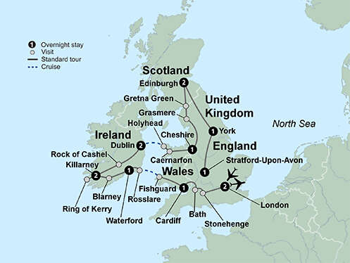 Travel to some of the world’s most magnificent cities and through the magical countryside of Britain and Ireland. This comprehensive journey takes you through rolling farmland and across the Irish Sea, through England, Ireland, Scotland and Wales. Marvel at the mystery of Stonehenge. Experience Ireland’s culinary renaissance during a cooking class at one of Dublin’s premier culinary institutes. Walk in the footsteps of William Shakespeare at his birthplace, Stratford-upon-Avon. Be mesmerized by the breathtaking landscapes in the English Lake District, Ireland’s Ring of Kerry and the valleys, mountains and imposing castles of North Wales. Admire the ancient Roman ruins at Hadrian’s Wall and in elegant Bath. Get acquainted with Britain’s pageantry in the royal cities of Edinburgh and London.