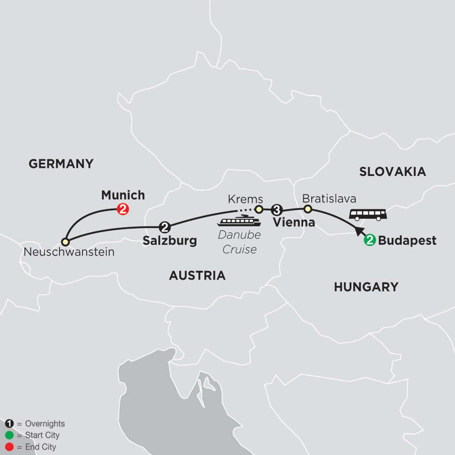 Join us for a royal adventure through the historic sites of Hungary, Slovakia, Austria, and Germany! This affordable tour of Europe takes you to some of the continent’s most legendary sites, including a Danube River cruise through Austria’s stunning Wachau Valley. Begin in Budapest—called the “Pearl of the Danube.” Explore the Hungarian capital with its treasure trove of architectural wonders with a guided city tour. You’ll travel through Slovakia, stopping in Old Town Bratislava, on your way to Austria. You’ll spend two glorious days in Vienna, the “City of Music”—with guided sightseeing of its enchanting city center with its iconic sites. You’ll board your boat in Krems for a river cruise along the Danube’s Wachau Valley to Salzburg. Enjoy an orientation in Salzburg, the exquisite city of Mozart’s birth. You’ll experience more stunning sights on your way to Munich, with a visit to the storybook site of King Ludwig’s Neuschwanstein Castle. You’ll tour the lavish halls inside this inspiration of Disney’s Magic Kingdom, with stories of the King’s descent into madness. Your European vacation ends with two fascinating days in Munich. Tour the Marienplatz (Main Square) catch a Glockenspiel performance on the new Town Hall, or relax in a traditional biergarten for a stein or two of classic German beer. Your value-minded tour of Hungary, Vienna, and Germany through some of Europe’s favorite destinations is a royal experience not to be missed!