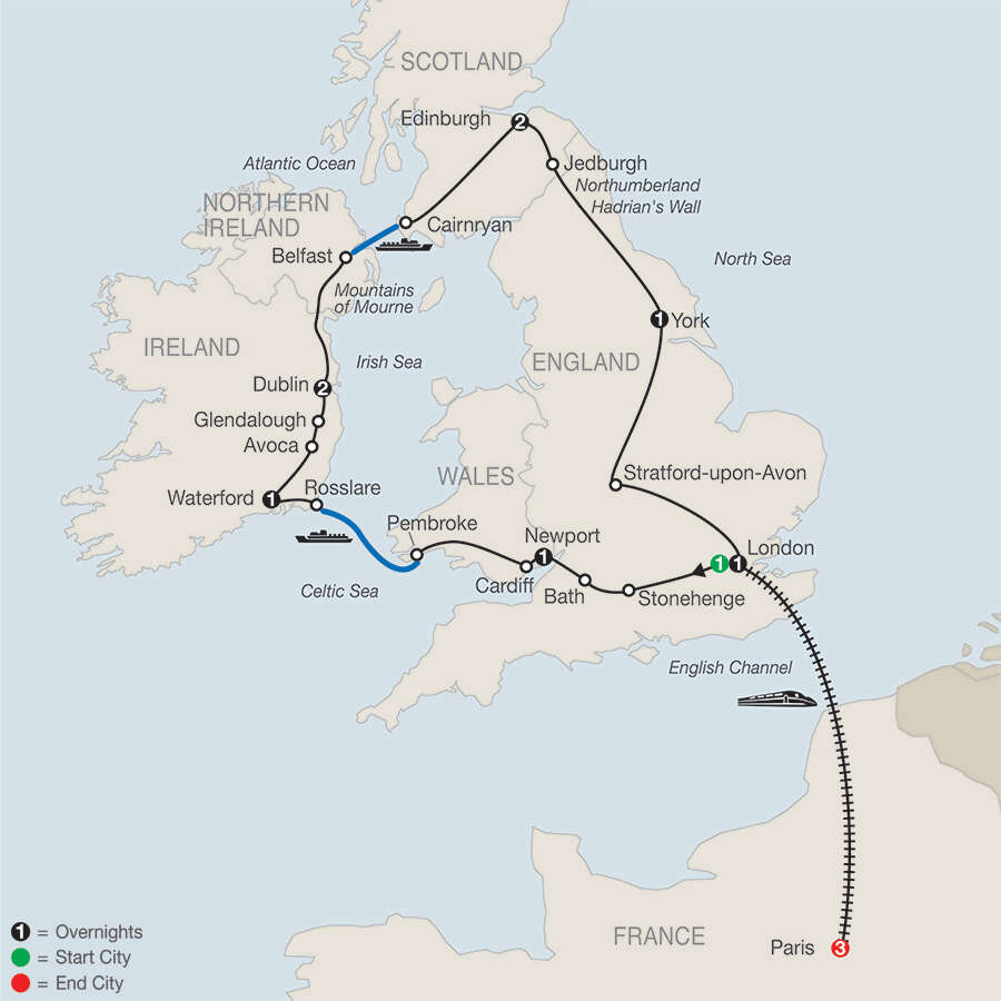 STONEHENGE Visit the prehistoric monumentBATH Visit the Roman relicsNEWPORT Welcome dinnerCARDIFF Orientation drive, guided tour of Cardiff CastlePEMBROKE–ROSSLARE Cross St. George’s Channel by ferryWATERFORD [LF] Enjoy a traditional Irish coffee; guided tour of the House of Waterford CrystalAVOCA [LF] Guided tour of the handweaving millGLENDALOUGH Guided tour of St. Kevin’s center of Irish ChristianityDUBLIN Orientation driveBELFASTOrientationBELFAST–CAIRNRYAN Cross the North Channel by ferryEDINBURGH Guided sightseeing, visit Edinburgh CastleJEDBURGH Take pictures of the abbey ruinsYORK Walking tourSTRATFORD-UPON-AVON Take pictures of Anne Hathaway’s Cottage, visit Shakespeare’s birthplace and [LF] enjoy lunchLONDON-PARIS By high-speed Eurostar TrainPARIS Guided sightseeing, visit the Notre Dame Cathedral and The Louvre