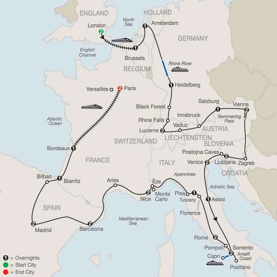 LONDONGuided sightseeing, visit St. Paul’s CathedralLONDON–BRUSSELS By high-speed Eurostar trainBRUSSELS Visit Grand’Place; [LF] enjoy a waffle and beer tasting at a local café; welcome dinnerAMSTERDAM Canal cruise; diamond centerRHINE CRUISEHEIDELBERGTake pictures of the castleBLACK FOREST Hear about the art of woodcarvingRHINE FALLSLUCERNEWalking tour including the Lion Monument and Chapel BridgeVADUZ Visit the capital of LiechtensteinINNSBRUCK Walk to the Golden Roof SALZBURG[LF] A special dinner at Farmhouse Lenzenbauer; guided walking tour, visit Mirabell Gardens and Residenz Square VIENNAGuided sightseeing, visit Heldenplatz and Cathedral Square; admire the unusual HundertwasserhausZAGREBGuided sightseeing; visit the cathedralLJUBLJANAGuided sightseeing, visit St. Nicholas’ Cathedral POSTOJNA[LF] Visit the Postojna Caves by mini-trainVENICEPrivate boat ride; guided walking tour, visit St. Mark’s Square & Basilica, Doges’ Palace and the Bridge of Sighs; glassblower demonstrationASSISIVisit St. Francis’ Basilica SORRENTO[LF] Excursion along the Amalfi Coast to Positano, taste a glass of Limoncello; excursion to Capri, including jetfoil boat ride, funicular ride, and guided sightseeingPOMPEIIGuided walking tour of the excavations ROME Guided sightseeing, visit the Vatican Museums and Sistine Chapel, St. Peter’s Square and Basilica, and the ColosseumFLORENCEGuided walking tour, visit Signoria Square; see Ponte Vecchio PISAMarvel at the legendary Leaning Tower ÈZEVisit a perfume factoryARLESWalk to the Roman AmphitheaterBARCELONAGuided sightseeing, visit the gothic quarter; take pictures of the Sagrada Familia BasilicaMADRIDGuided sightseeing, visit the Prado Museum BILBAOVisit the Guggenheim MuseumBIARRITZOrientation BORDEAUXOrientation drive BORDEAUX–PARISBy high-speed TGV train (first-class) PARISA special dinner at a local restaurant, ascend the Eiffel Tower and guided sightseeingHeadsets throughout the tour