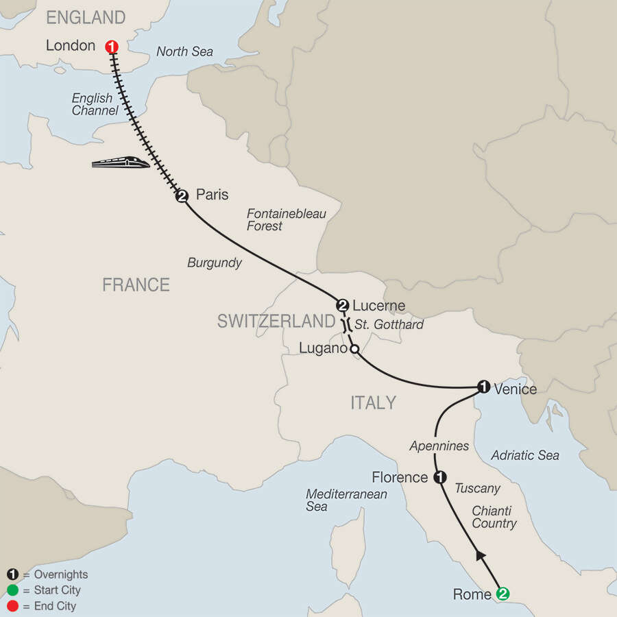 ROMEWelcome dinner at a local restaurant; guided sightseeing, visit the Vatican Museums and Sistine Chapel, St. Peter’s Square and Basilica, and the ColosseumFLORENCEGuided walking tour, visit Michelangelo’s David and Signoria SquareVENICEPrivate boat ride; visit St. Mark’s Square; glassblower demonstration; [LF] pasta dinner at a local restaurantLUGANOStop at the lakesideLUCERNEWalking tour including the Lion Monument and the Chapel BridgePARISGuided sightseeing; ascend the Eiffel TowerPARIS-LONDONBy high-speed Eurostar train