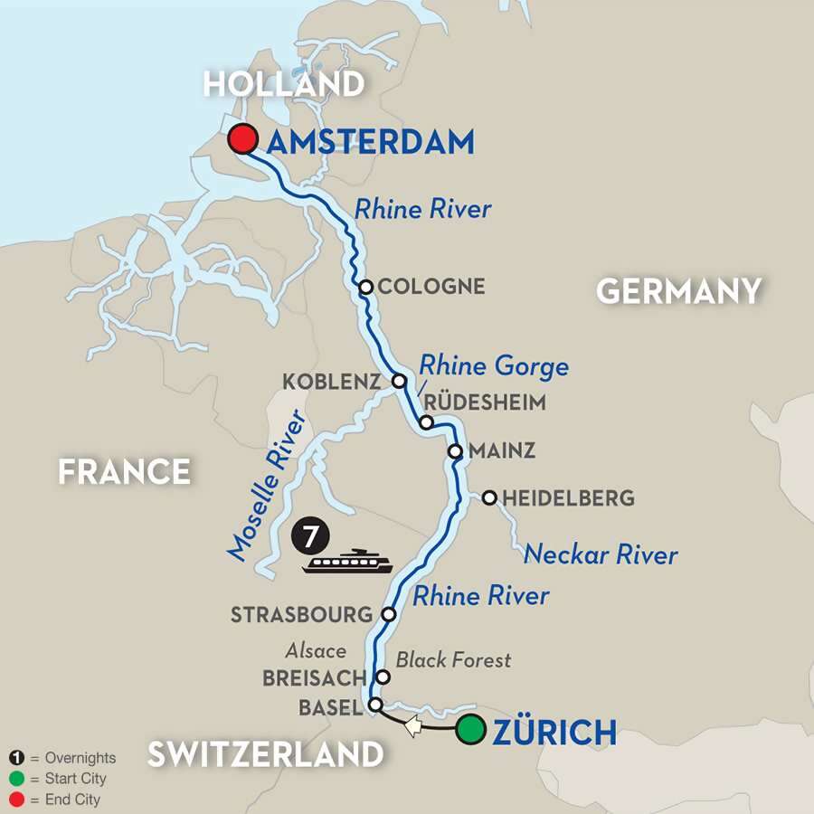 Day 1 Zürich–Transfer to Basel (Embarkation): onboard welcome receptionDay 2 Breisach. Excursion to the Black Forest: visit a woodcarver’s workshop; Christmas marketDay 3 Strasbourg: guided sightseeing, visit La Petite France district and the gothic cathedral; Christmas marketDay 4 Excursion to Heidelberg–Mainz: guided visit of the castle, see the Great Vat in Heidelberg; Christmas market; visit the Gutenberg Museum in Mainz; Christmas marketDay 5 Rüdesheim–Rhine Gorge: visit Siegfried’s Mechanical Musical Instrument Museum in Rüdesheim and enjoy a special treat; Christmas market; cruise through the Rhine GorgeDay 6 Cologne: guided city walk; Christmas marketDay 7 Amsterdam: canal cruiseDay 8 Amsterdam (Disembarkation): your vacation ends this morning
